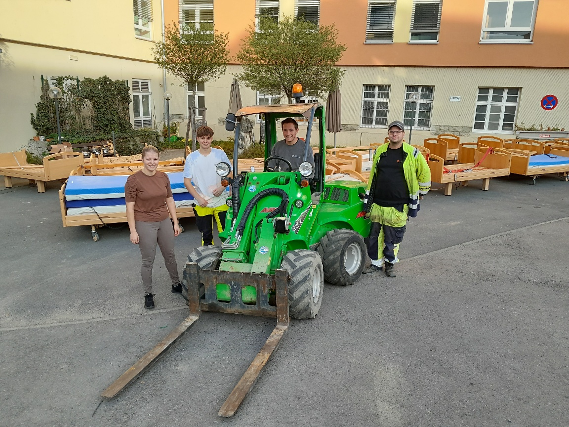 „Es ist eine Win-win-Geschichte: Wir haben jetzt das alte Haus ziemlich leer und die Ukraine bekommt Betten“, sagt Heimleiterin Regina Scherer. Denn das alte Gebäude des Carolinums, einer Pflegeeinrichtung der Stiftung St. Johannes, die der katholischen Kirchengemeinde Bad Mergentheim angegliedert ist, wird ab 9. Oktober abgerissen. Beim Verladen der Ausstattung halfen neben den Hausmeistern der Stiftung auch Auszubildende vom Stadtwerk Tauberfranken. Das Versorgungsunternehmen stellte außerdem einen Radlader zur Verfügung. Hariolf Scherer, Mitglied im Kirchengemeinderat und zugleich Mitarbeiter beim Stadtwerk Tauberfranken, hatte diese Unterstützung organisiert.