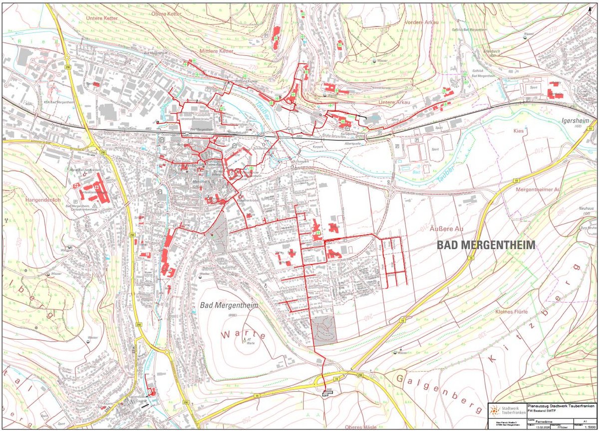 Die Übersichtskarte zeigt das bestehende Fernwärmenetz in der Kernstadt Bad Mergentheim. Das Bad Mergentheimer Fernwärmenetz hat mittlerweile eine Länge von ca. 18,8 km.